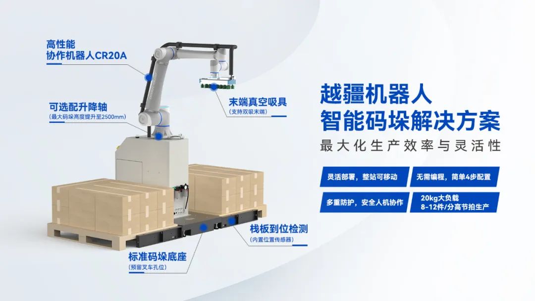 越疆機(jī)器人推出的智能碼垛解決方案以精準(zhǔn)高效、靈活智能、安全協(xié)作的顯著特點(diǎn),在食品飲料、電子制造、物流倉(cāng)儲(chǔ)等多行業(yè)落地應(yīng)用,助力制造企業(yè)邁向柔性化、高效化、智能化的全新階段。