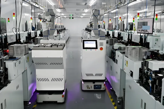 在半導體車間,越疆復合機器人自主穿梭于多臺固晶機之間,高精度的機械臂精準完成上下料任務,并將產品穩定、高效地運輸至指定位置,使車間生產效率提升 50% 以上。這些復合機器人充滿電后可連續工作10 小時以上,憑借強大的續航能力與高效的工作能力,為車間生產效率帶來顯著提升。