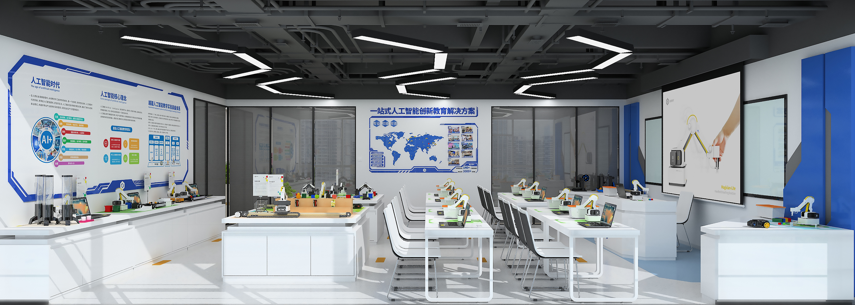 在教學空間設計方面,越疆科技為教學提供量身定制的 AI 教育環境,建設標準化的人工智能實驗室,全方位滿足課堂教學、學科競賽、師資培訓、參觀展示等需求。
