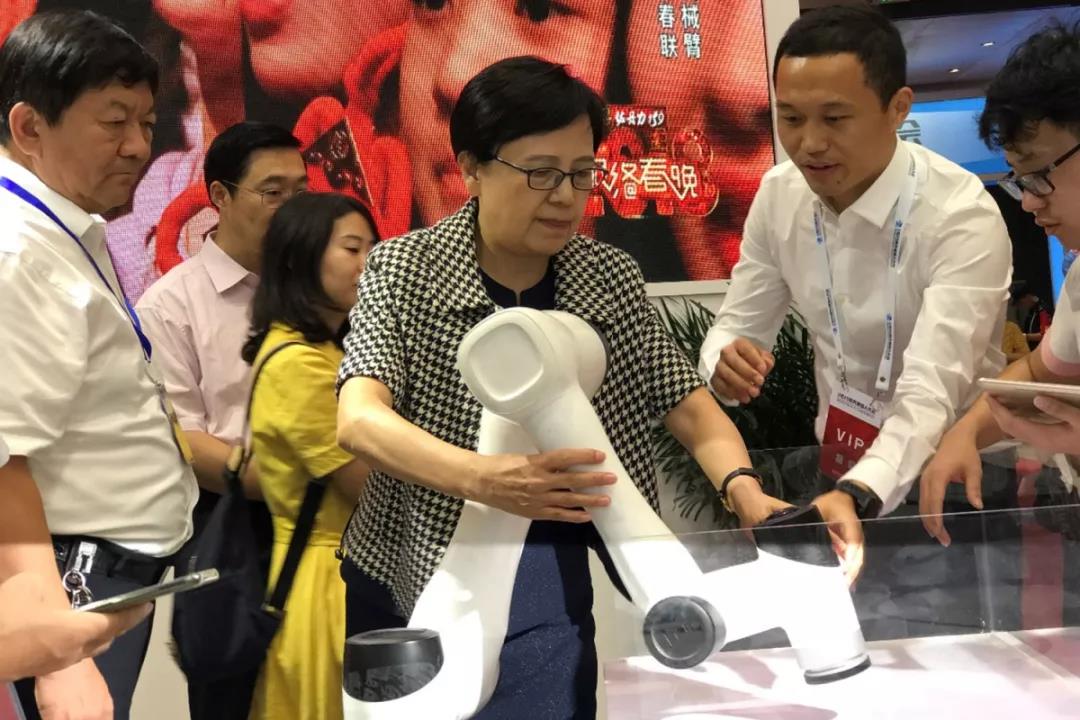 8 月 21 日下午,教育部原副部長、中國職業技術教育學會會長魯昕蒞臨展會現場,親自體驗了越疆新一代無編程全感知協作機械臂 DOBOT CR5,詢問了產品研發設計思路并結合職業技術教育方面的問題對越疆的發展提出了若干指導意見。