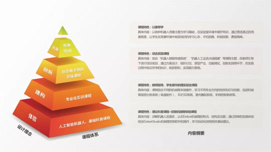 越疆人工智能教育基于中國學生發(fā)展核心素養(yǎng)和國家課程標準,融合傳統(tǒng)產(chǎn)業(yè)與跨學科技術(shù),產(chǎn)教融合,強化實踐,遵循“學、做、創(chuàng)” 一體化的全齡段創(chuàng)新教育改革思路,以創(chuàng)意物化、機器人競賽為主線,大力推進系列化、工程性、創(chuàng)新性項目教學,構(gòu)建體現(xiàn)學生不同發(fā)展取向的課程體系,最大限度地提供多維度的課程內(nèi)容,強化學生的綜合能力、工程能力、創(chuàng)新能力。
