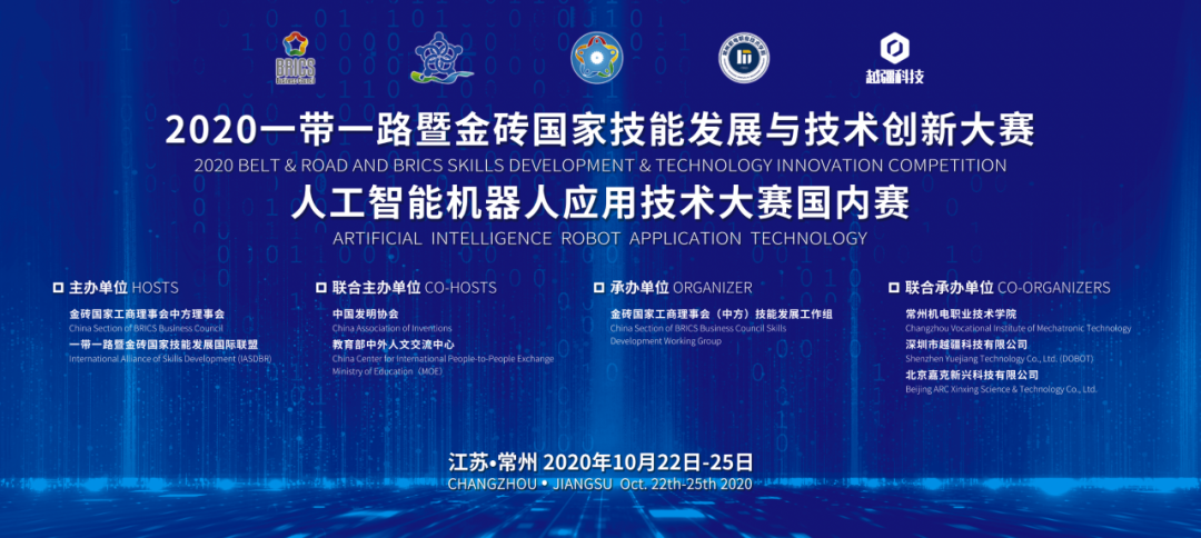 2020 年 10 月 22 日 - 25 日,2020 一帶一路暨金磚國家技能發展與技術創新大賽之人工智能機器人應用技術大賽國內賽決賽在常州機電職業技術學院隆重舉行。