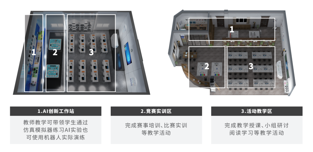 經典版與高級版則在普及版的基礎上擴大 AI 創新工作站的面積,并增設賽事培訓區,為學生提供更大的創新實踐空間和競賽培訓場地,配備更加完備的軟硬件設備,進一步培養學生溝通協作能力、創新能力以及人工智能各項關鍵技術綜合應用能力。