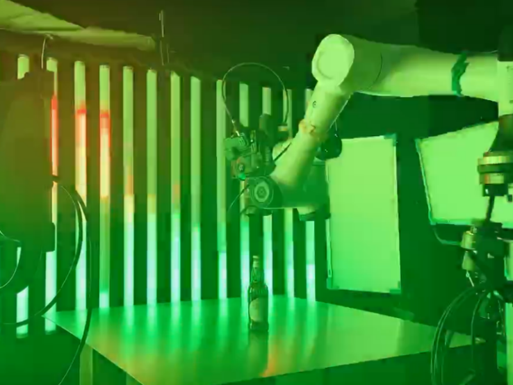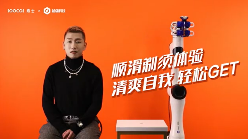 在電動剃須刀廣告拍攝現場,一臺協作機器人正「手握」剃須刀緊貼著一名模特面部,為他清理胡須。這名機器人演員來自越疆 CR 系列,具備優異的性能,通過軌跡復現功能,可在人臉復雜的曲面運動中操控自如,輕松完成剃須動作。
