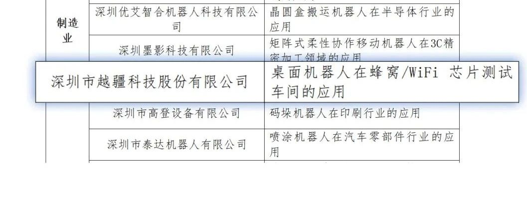 近日,深圳市工業(yè)和信息化局發(fā)布了《深圳市智能機(jī)器人應(yīng)用示范典型案例》(第一批)的通知,越疆憑借「桌面機(jī)器人在蜂窩/WiFi 芯片測(cè)試車間的應(yīng)用」入選其中,并成為首批上榜的企業(yè)。