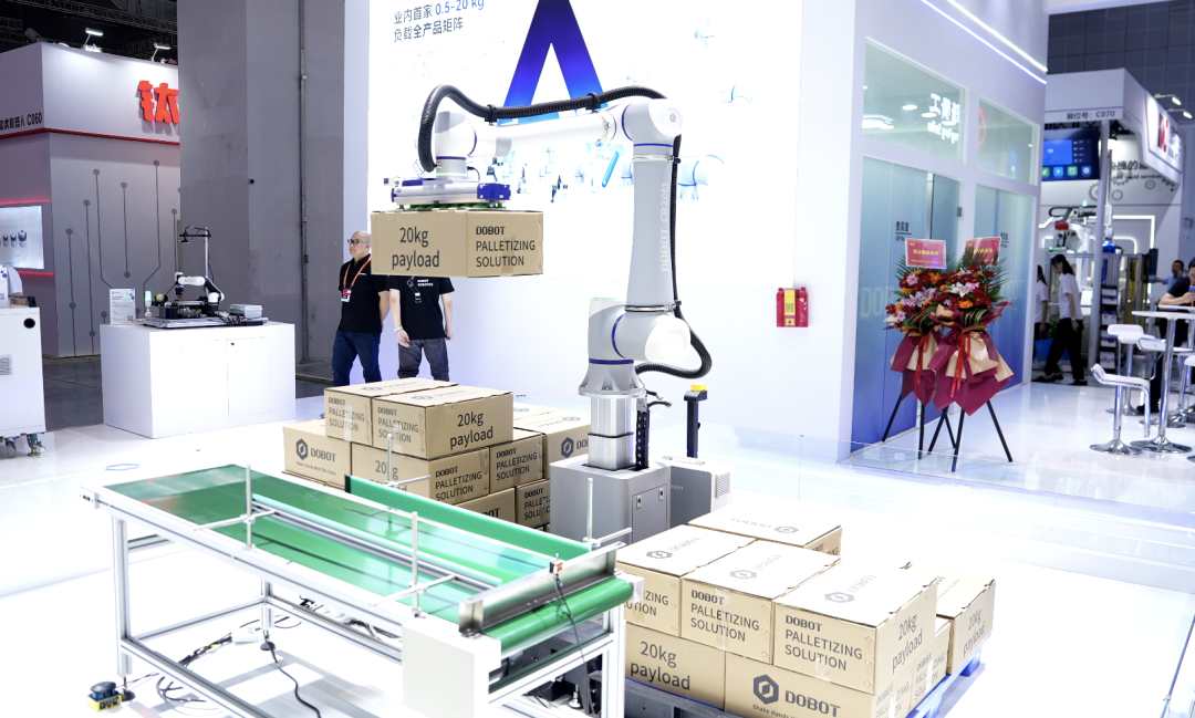 展會現場的碼垛解決方案以 CR20A 協作機器人為主體,整套設備高度集成,可即插即用。
