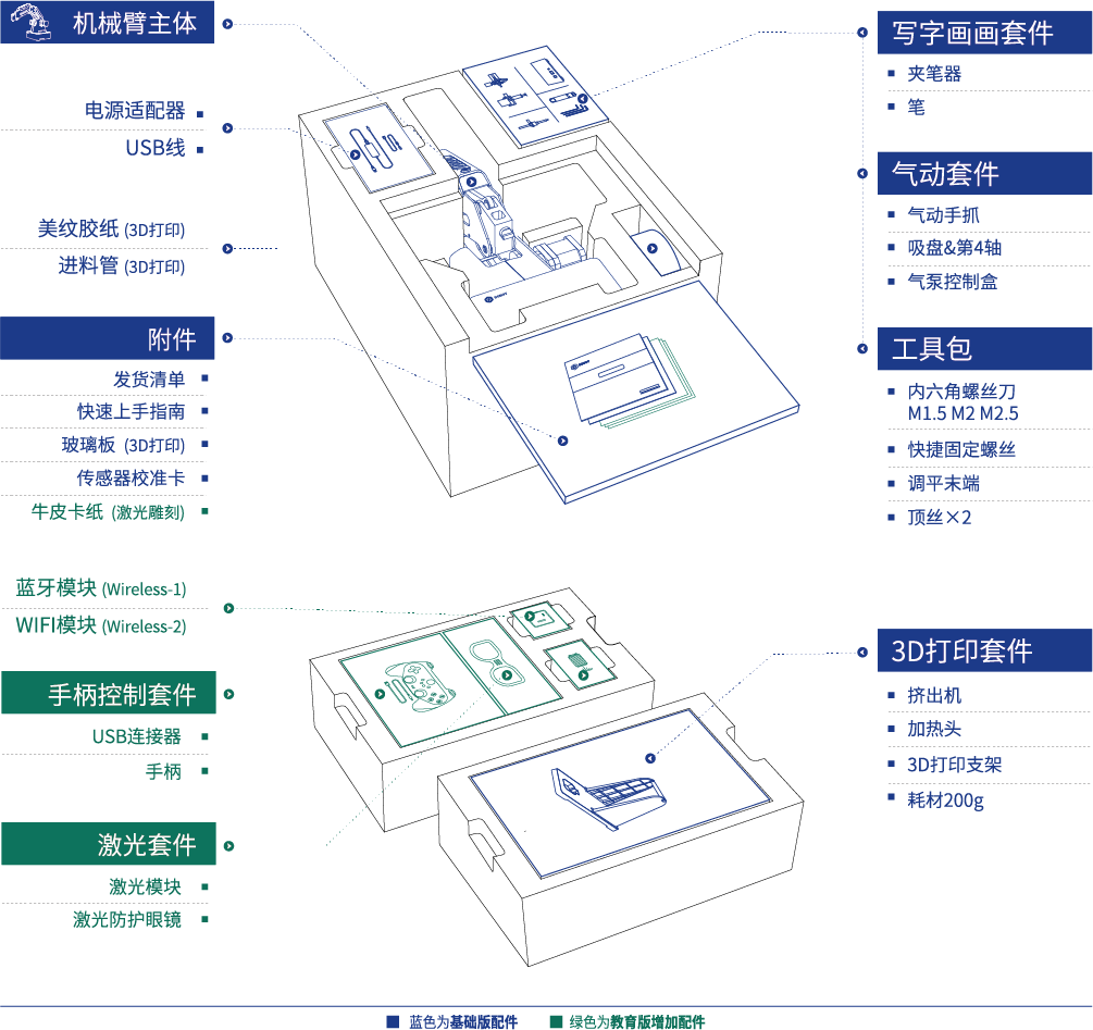 基礎(chǔ)版本套件有機(jī)械臂本體、吸盤、手爪。 教育版本在基礎(chǔ)版的基礎(chǔ)之上...